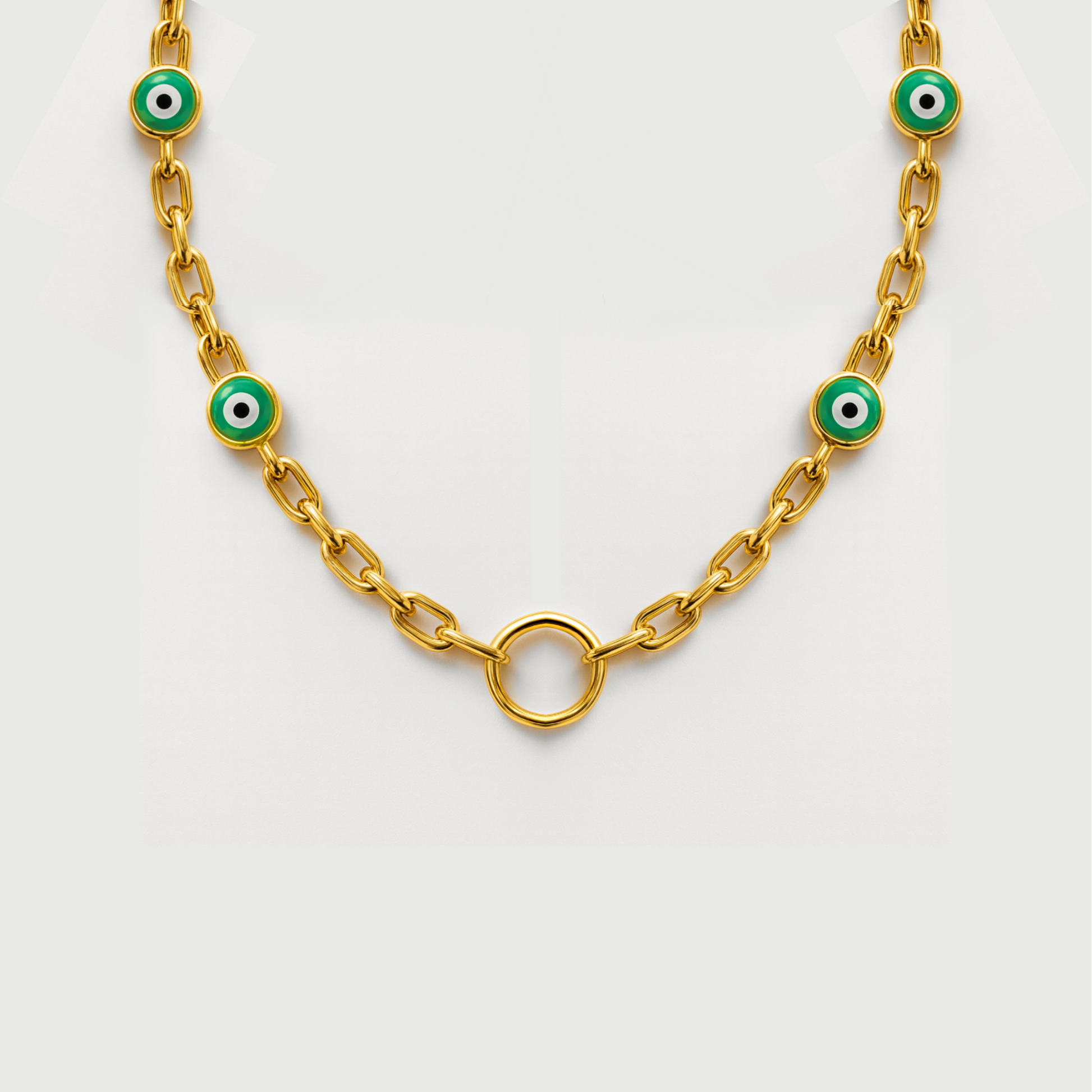 Transform your necklace collection with our gold evil eye necklace, handmade with green enamel evil eye beads on a 2.5-micron thick 18ct gold vermeil chain.