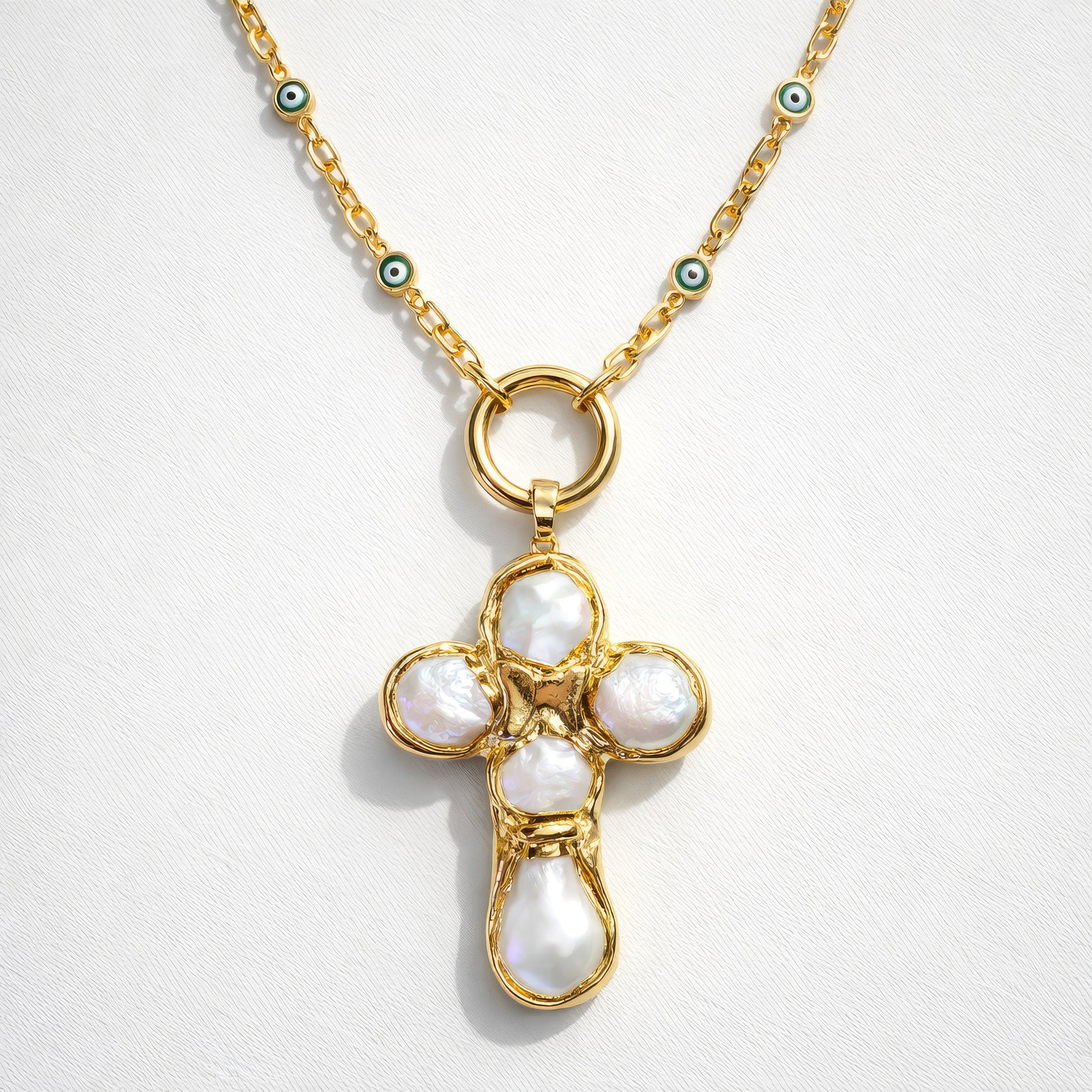Molten Gold Evil Eye & Pearl Cross Necklace