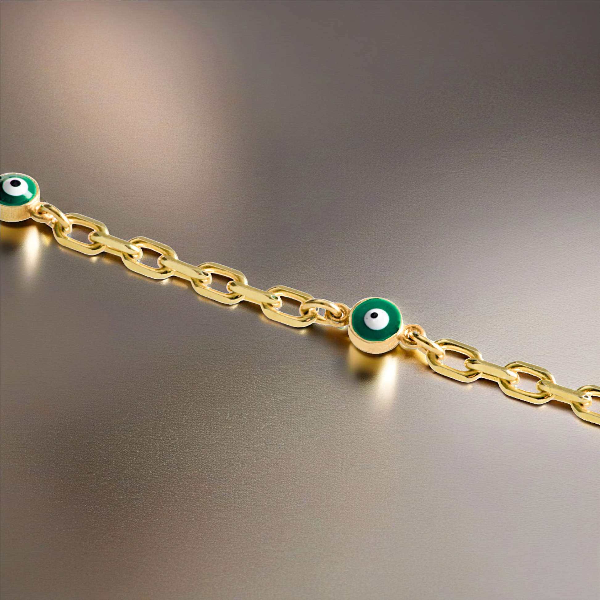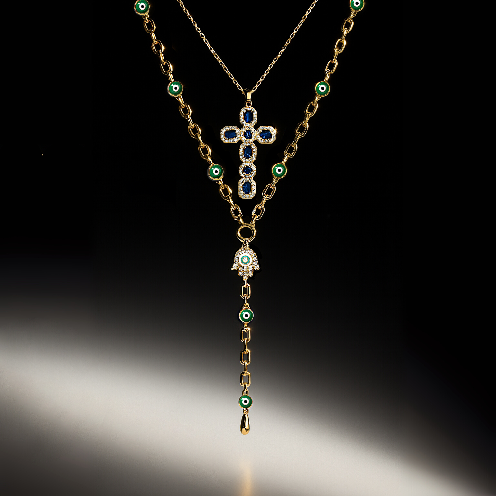 • Necklace 2: A sleek gold evil eye lariat necklace, adorned with a micro pavé Hamsa pendant and a white diamond initial letter charm for added meaning and protection.