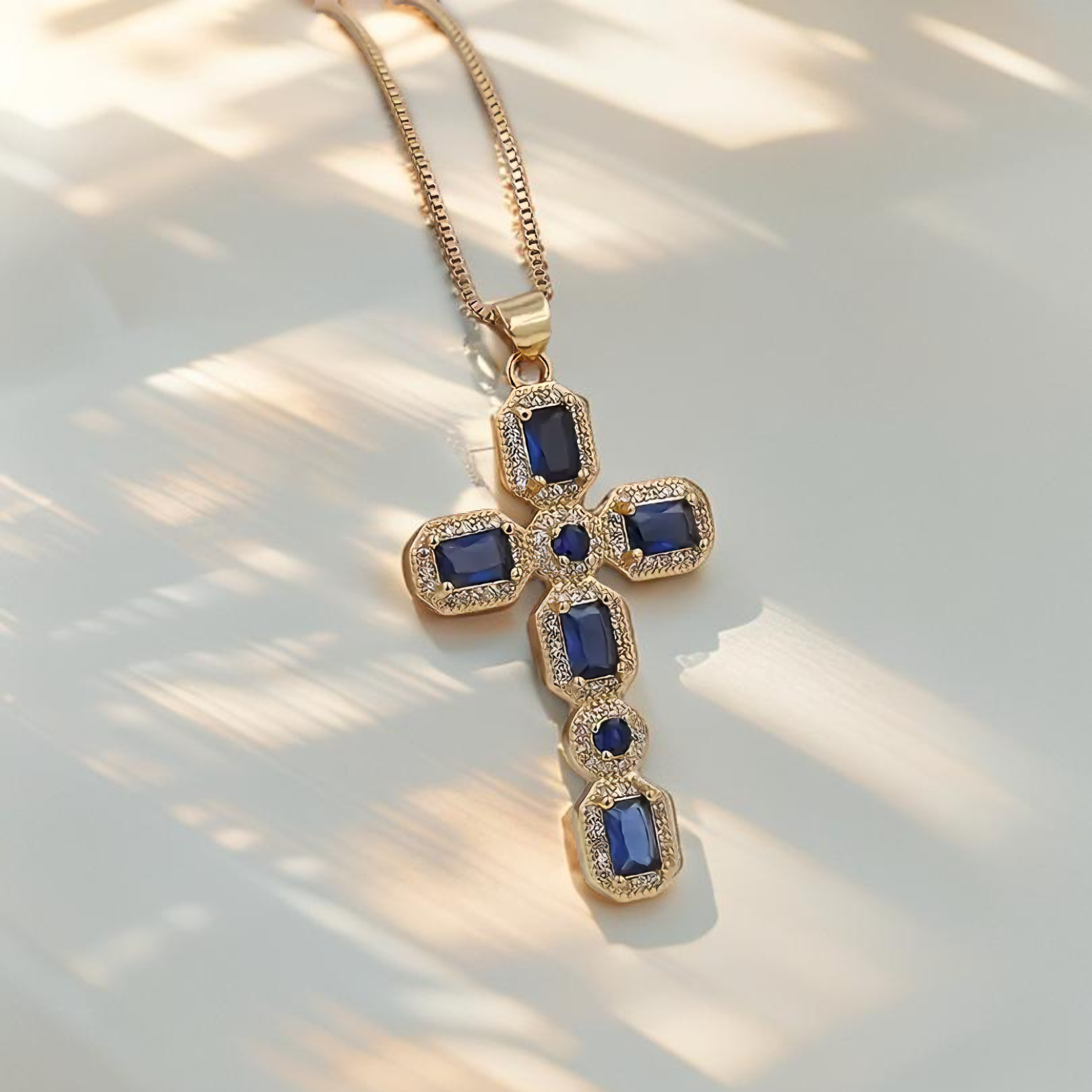 • Necklace 1: A dainty 18ct gold vermeil chain featuring a navy pavé cross pendant, set with deep blue glass stones and cubic zirconia for a bold yet elegant finish.